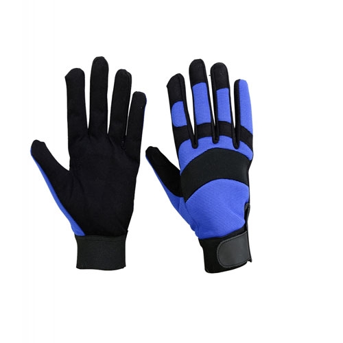 Black Synthetic Leather , Synthetic Leather on 3 Fingure Tips , Back Blue Spandex , Neoprene Knuckle on Back , Long Elastic and Hoop & Loop Company Logo Stapp