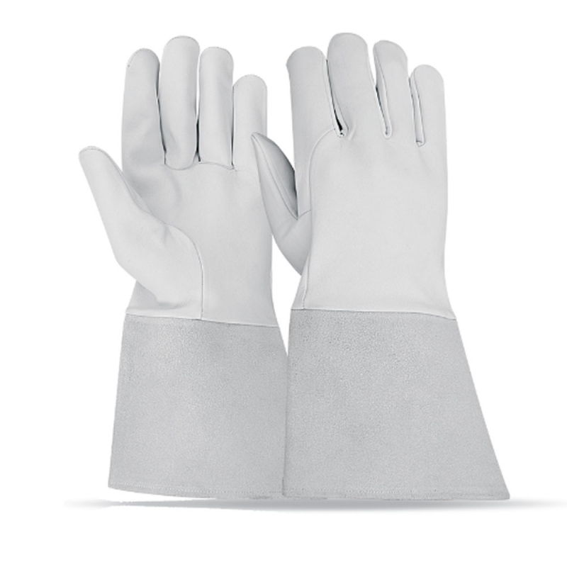 Leather: Goatskin Colour: Natural Thumb: Straight Cuff: 10 cm cow split leather cuff Additional: Wrapped around index finger